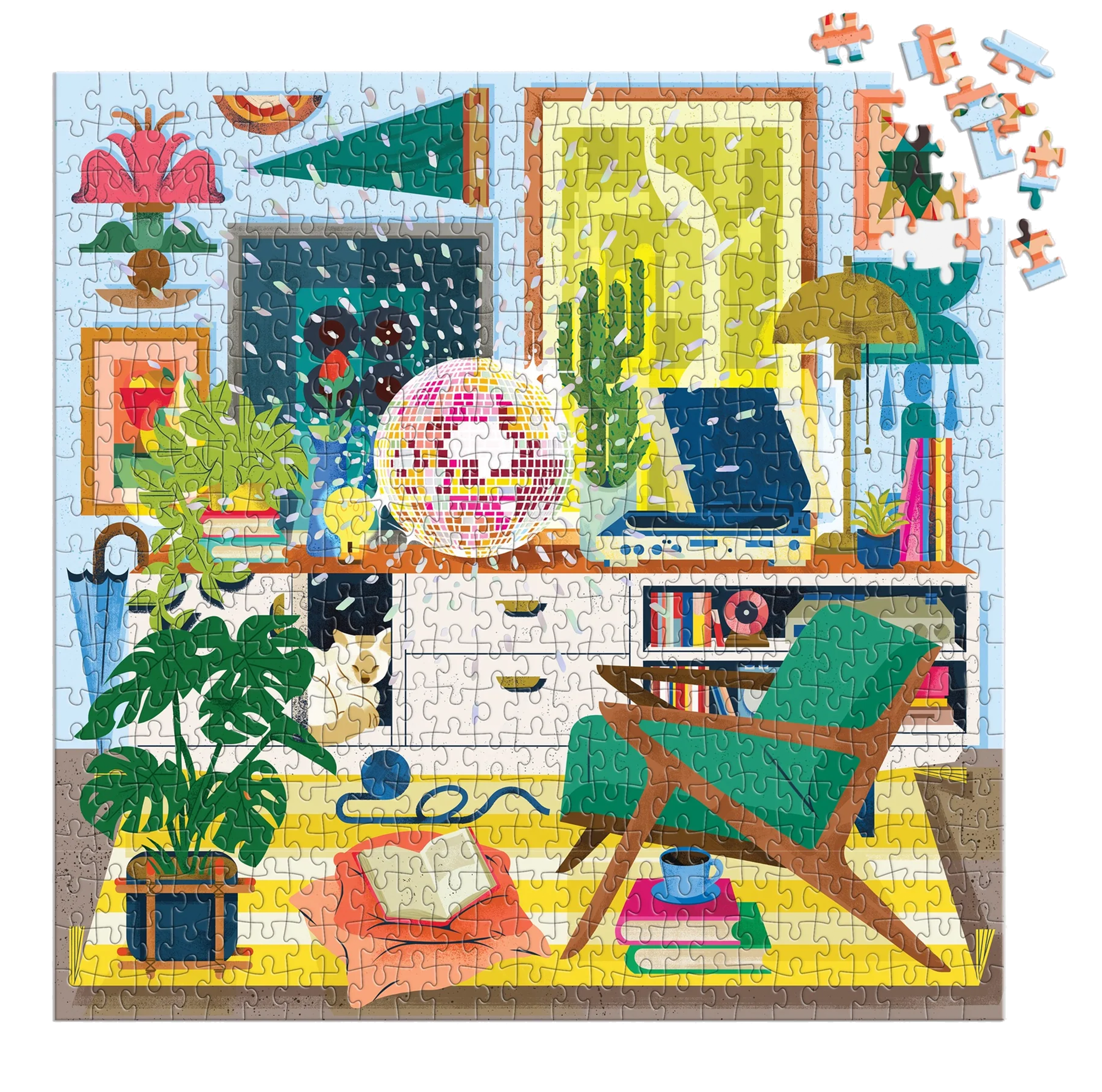 Commissioned by Galison. A stunning still life print of a chic living room, beautifully centered around a dazzling disco ball. A vibrant blend of retro charm and modern elegance, the illustrated 500pcs foil puzzle features a scene that is a delightful mix of vintage and contemporary styles.